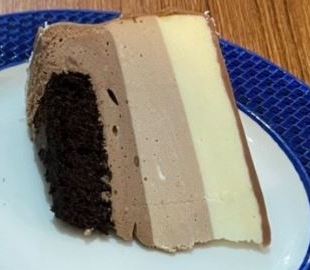 Так само повторюємо для молочного та чорного шоколаду. Кожен шар має повністю загуснути до того, як додаємо наступний. Тому я відразу відправляла його в морозильну камеру, поки готувала новий. В останній шар занурюємо наш бисквіт так, щоб він порівнявся з мусом і не виступав.
